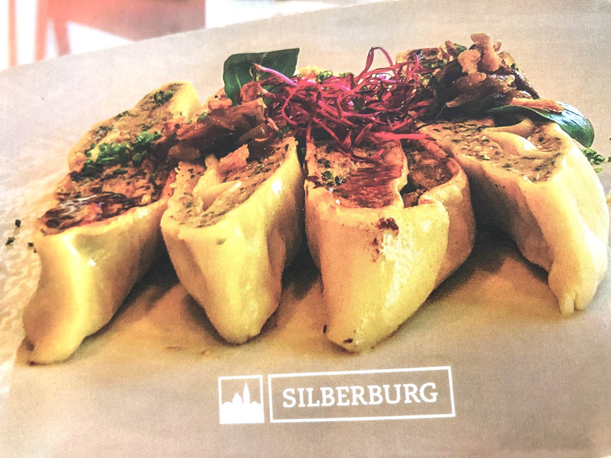 Das Rezept für dieses „Maultaschen-Mosaik mit geschmälzten Zwiebeln und einem Fadennest aus Rote-Beete-Sprossen“ gibt es im Anhang des Buches zum Nachkochen. Zusammen mit ein paar weiteren schwäbischen Leckereien!