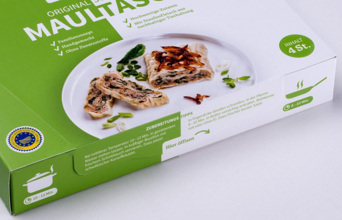 Der Teig hat es nicht weit zur Füllung. Keine fünf Kilometer entfernt treffen sie sich: in der Maultaschen-Hauptstadt Stuttgart. Hier lassen wir die Königinnen der schwäbischen Genusskultur fertigen. Sie tragen mit Stolz das EU-Siegel g.g.A.: Geschützt geografische Angabe. Sie dürfen sich also Original Schwäbische Maultaschen nennen.