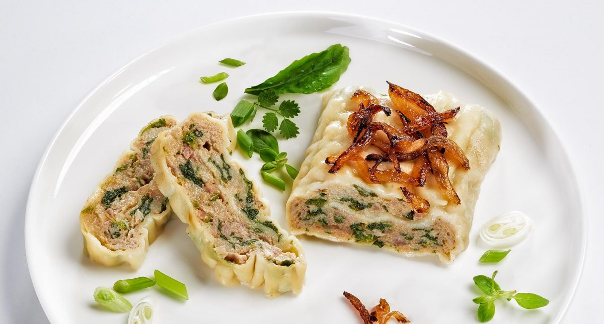 Hinzu kommen Eier aus Bodenhaltung, junger Blattspinat, milde Zwiebeln, Weißbrot, Trinkwasser, Steinsalz, Majoran, Muskatnuss, Pfeffer. Der frische Nudelteig stammt aus Fellbach bei Stuttgart.