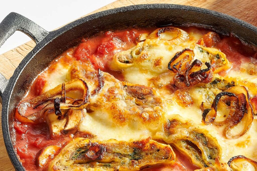 - Zuletzt die Zwiebelringe auf dem Gericht verteilen und alles für ca. 30 Minuten in den Ofen geben, bis Mozzarella und Zwiebeln goldbraun sind.