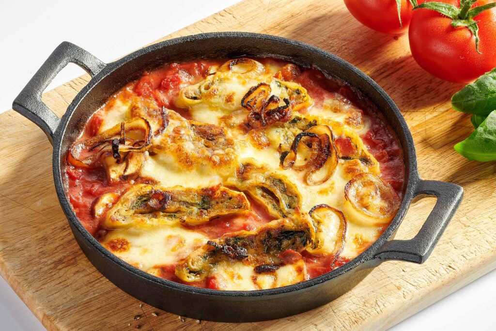 - Tomatensoße über die Maultaschen geben und alles mit frischem Mozzarella garnieren. Den Mozzarella hierbei nicht schneiden, sondern zerrupfen!