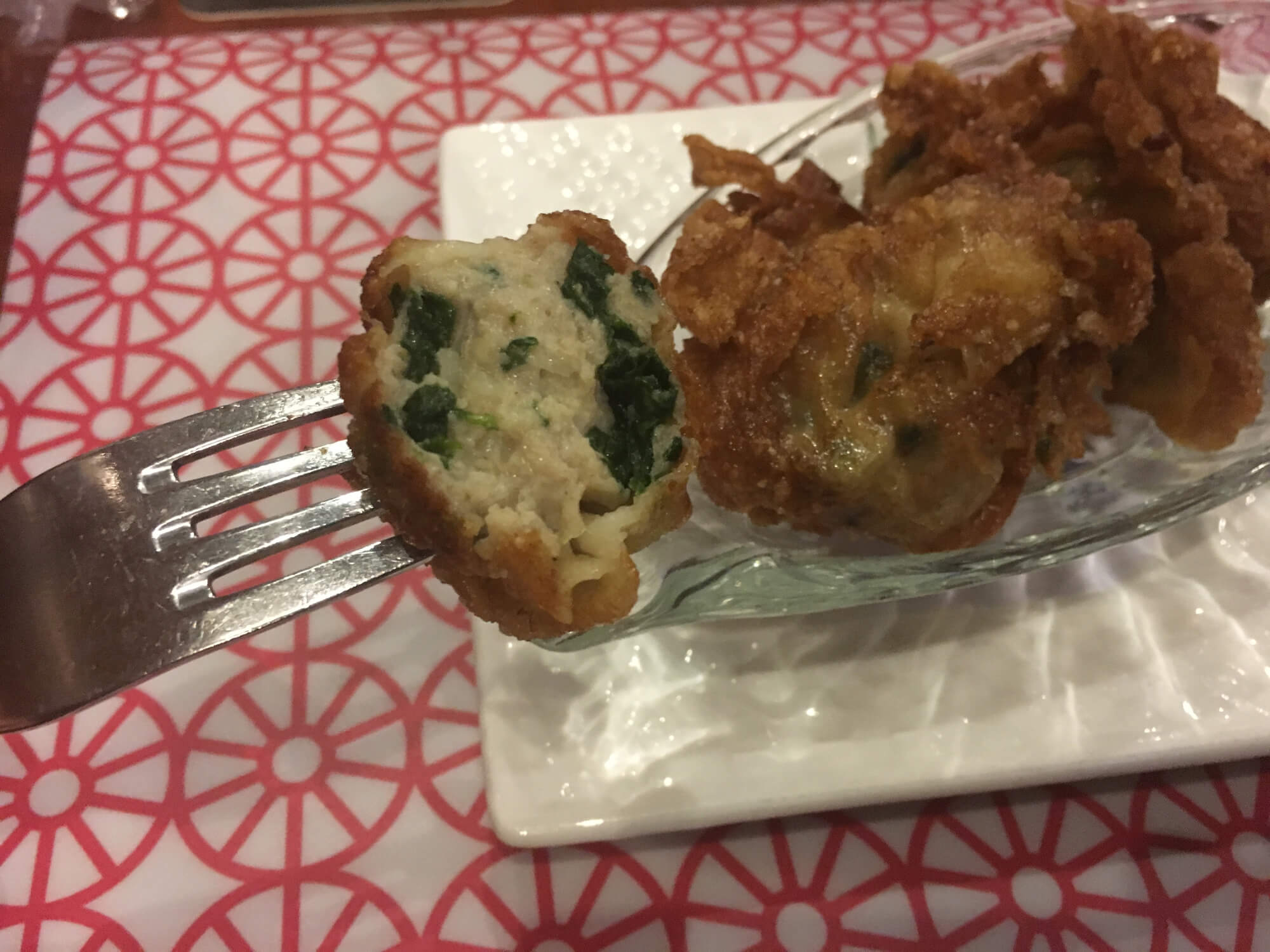 Sei‘s drum: Wir waren ja wegen der Täschchen gekommen. Rasch zwei Portionen bestellt, für rund 9,50 Euro (240.000 Dong). Was uns dann serviert wurde sah eher aus wie Hoanh Thanh Chien aus der vietnamesischen Teigtaschenhochburg Hoi An. Die frittierte Hülle hatte also schon mal so viel mit schwäbischen Maultaschen zu tun wie Onkel Ho mit dem kapitalistischen Antlitz seines vereinten Vietnams. Aber die Füllung war gar nicht mal so schlecht.