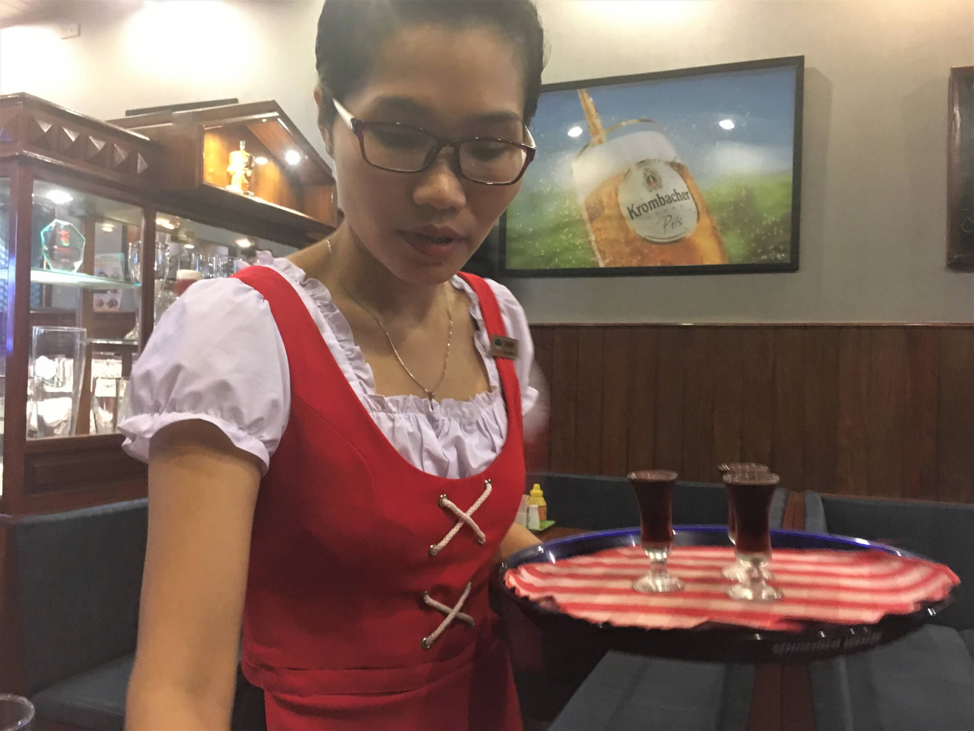 Das Restaurant ist empfehlenswert, vor allem für diejenigen, die wie wir nach zehn Tagen Vietnam einfach mal wieder was anderes essen wollten. Es ist letztlich ein herrlicher Spaß, zu beobachten, wie ein Thailänder versucht, inmitten Vietnams ein deutsches Ambiente zu schaffen, im Gastraum, auf der Speisekarte und in seiner Küche.