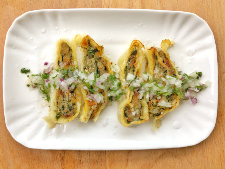 – Kleingehackte rohe Zwiebeln, Schnittlauch oder Petersilie darüber geben.