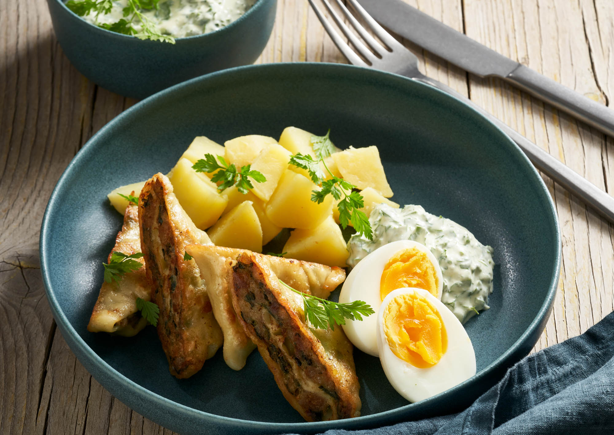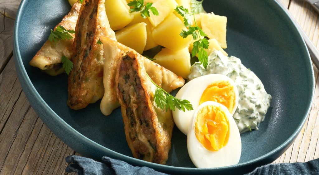 - ANRICHTEN: Maultaschen, Salzkartoffeln, je ein halbiertes Ei und die grüne Sauce auf Tellern anrichten und mit etwas Kresse garnieren.Copyright Foto Tellergericht: © Julia Ruby Hildebrand / Christan Verlag
