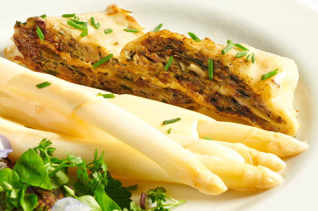 - ANRICHTEN. Teller vorwärmen. Eine Handvoll Salat am Tellerrand platzieren. Spargel mittig anrichten. Die Hollandaise darüber geben. Dann die Maultaschen ablegen und alles mit Schnittlauch dekorativ garnieren. Übrige Sauce im Schälchen mit auf den Tisch stellen.